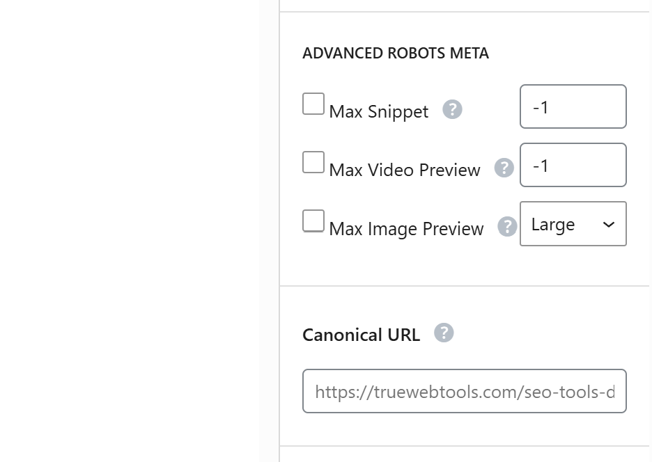 All in One SEO also supports canonical URLs in advanced settings. The approach is the same: rely on defaults unless you need tighter control.